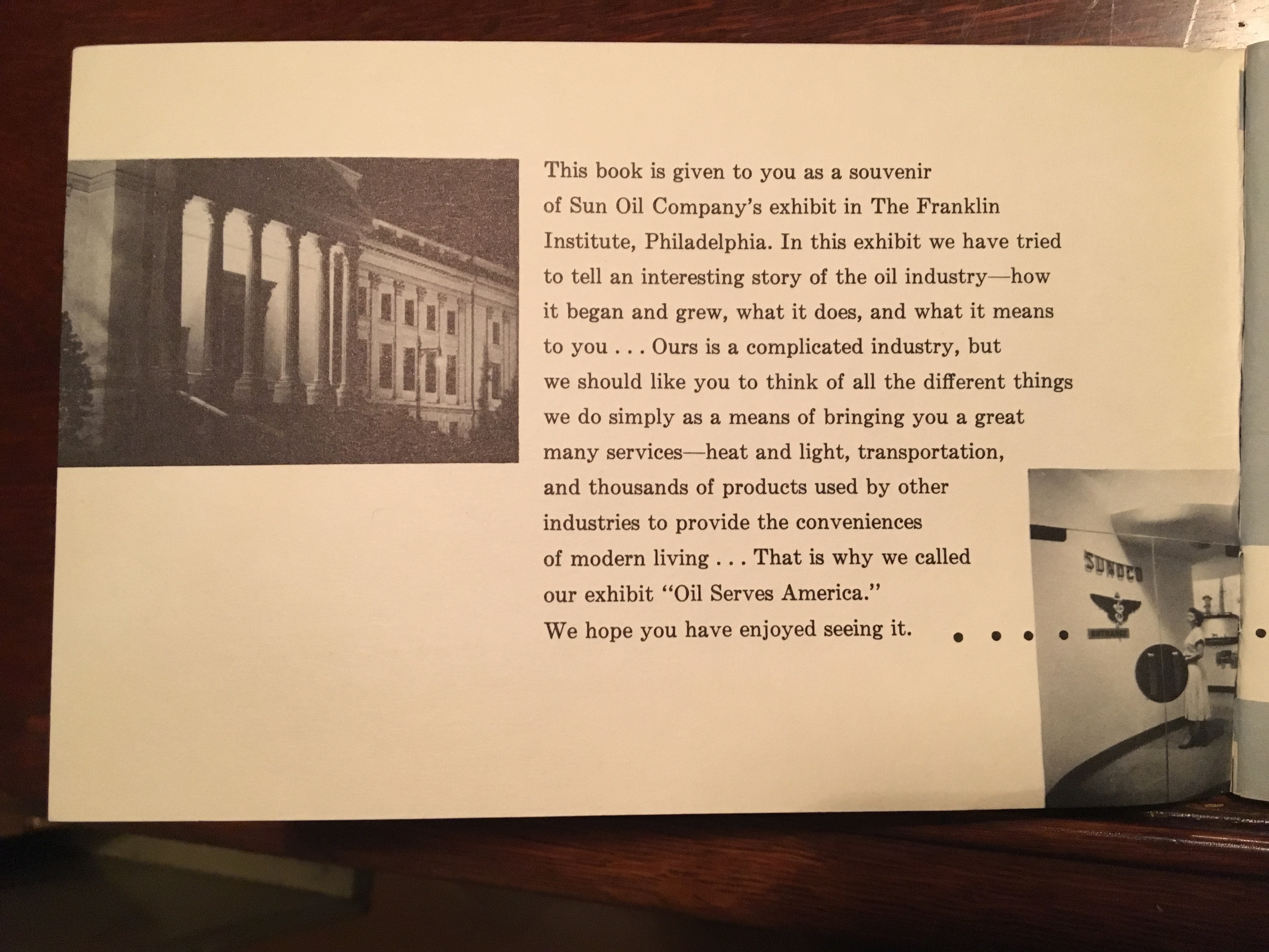 Statement of purpose from the Franklin Institite’s “Oil Serves America” exhibit booklet Posted on October 11, 2018October 11, 2018 by Dr. Dave Mc